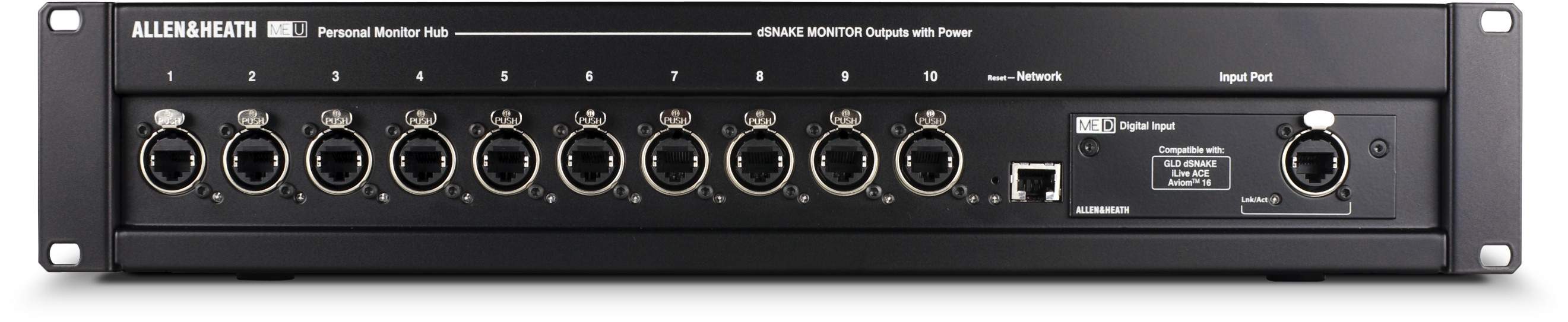 Allen & Heath ME-U to nowoczesny HUB (koncentrator) z dziesięcioma portami PoE (Power over Ethernet), który dostarcza zasilanie i sygnał audio do systemów ME-500 oraz ME-1. Posiada wbudowaną kartę dźwiękową, która może być użyta jako karta dźwiękowa z mikserami GLD, Qu Snake, dLive, iLive ACE czy Avion A-Net. Może zostać zastąpiona kartami typu: MADI, Dante, Waves SG czy EtherSound.