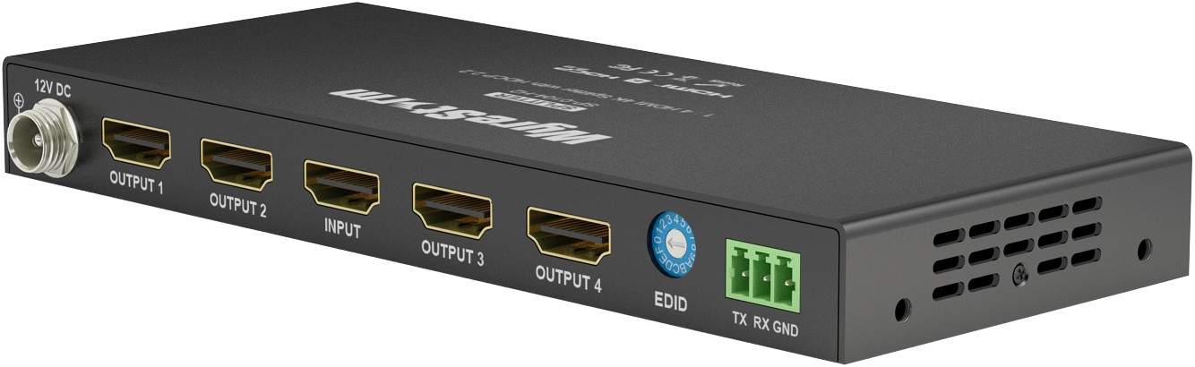 - Rozdziela sygnał z jednego urządzenia HDMI 4K/HDR lub 1080p HD na cztery urządzenia wyświetlające 4K/HDR lub HD.