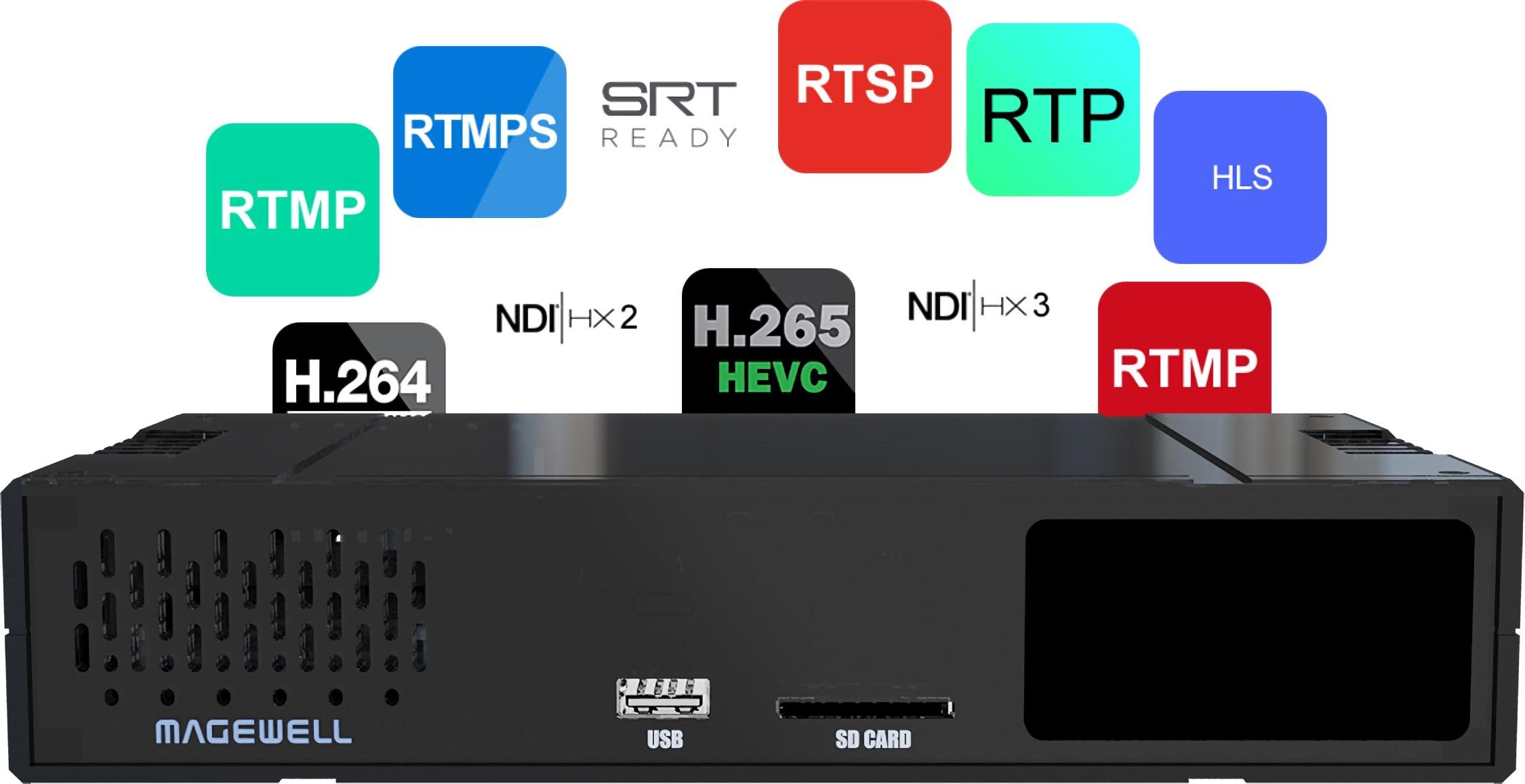 Ultra Encode AIO obsługuje wiele formatów kodowania wideo - w tym H.264, H.265 (HEVC), NDI®|HX 2 i NDI®|HX 3 - oraz szeroką gamę protokołów dostarczania, w tym RTMP, RTMPS, SRT, RTSP, RTP, HLS i technologię ISSP firmy TVU. W formacie AAC można zakodować do ośmiu kanałów audio.