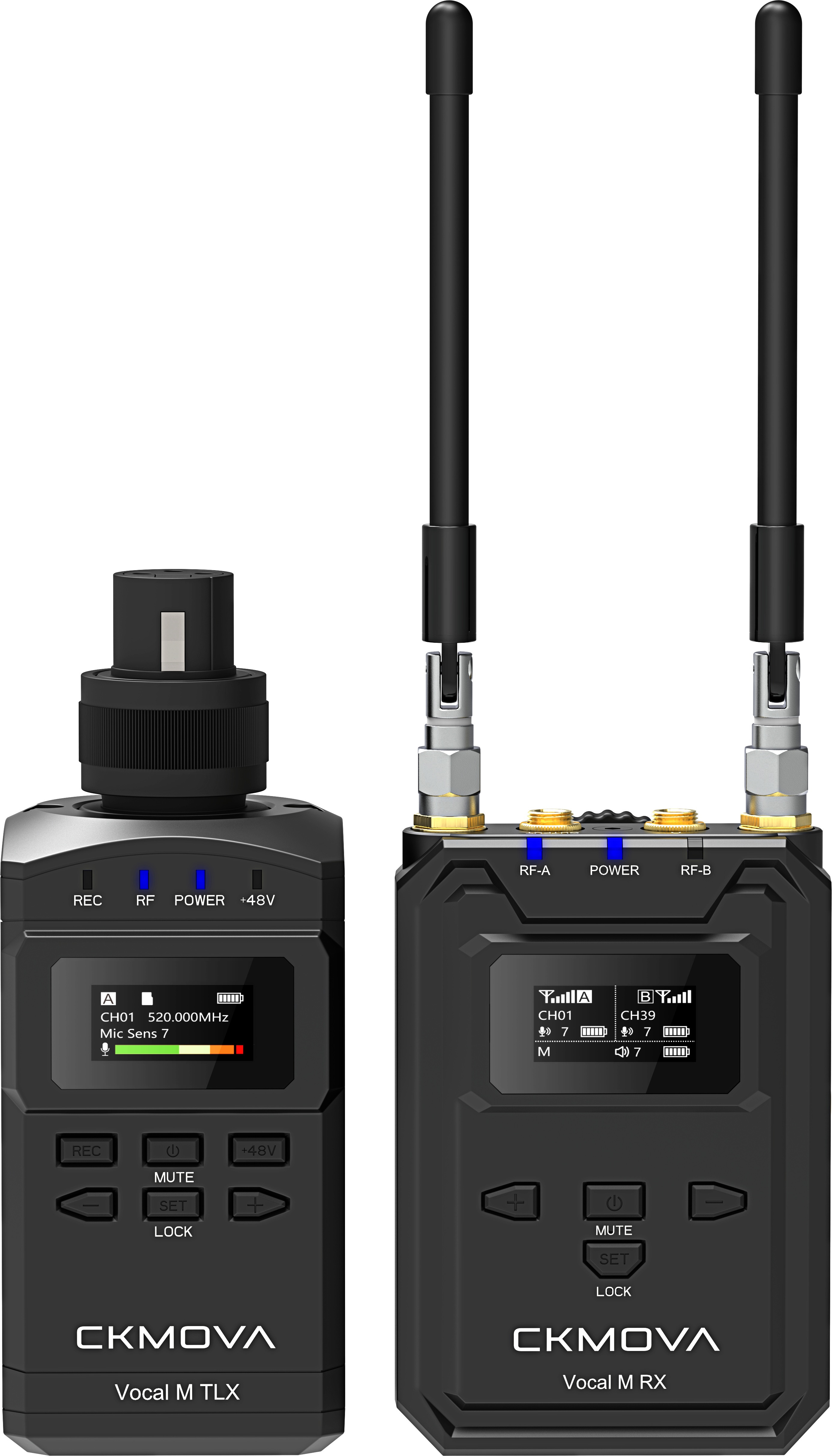 CKMOVA Vocal M V3 to profesjonalny bezprzewodowy system UHF typu plug-on do ENG i live, łączący nadajnik TLX z gniazdem XLR z dwukanałowym odbiornikiem true-diversity. TLX podaje 48 V phantom dla mikrofonów pojemnościowych i zapisuje backup na microSD w WAV (do 32 GB, ≈50 h). Odbiornik oferuje przełączane mono/stereo oraz lokalne wejście mikrofonowe 3,5 mm TRS, co rozdziela głos reportera i prowadzącego na osobne kanały.
