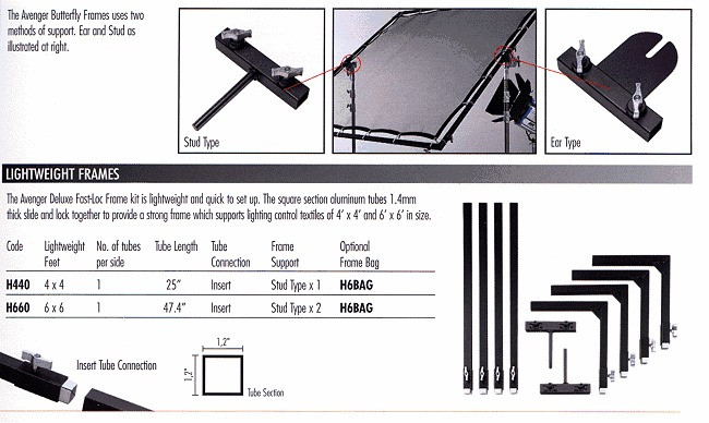 Lekka rama Avenger H660 wykorzystuje konstrukcję Fast-Loc, która spełnia swoją nazwę podczas ustawiania. Aluminiowe rurki o kwadratowym przekroju przesuwają się i blokują, tworząc mocną ramę, która wspiera tkaniny sterujące oświetleniem.