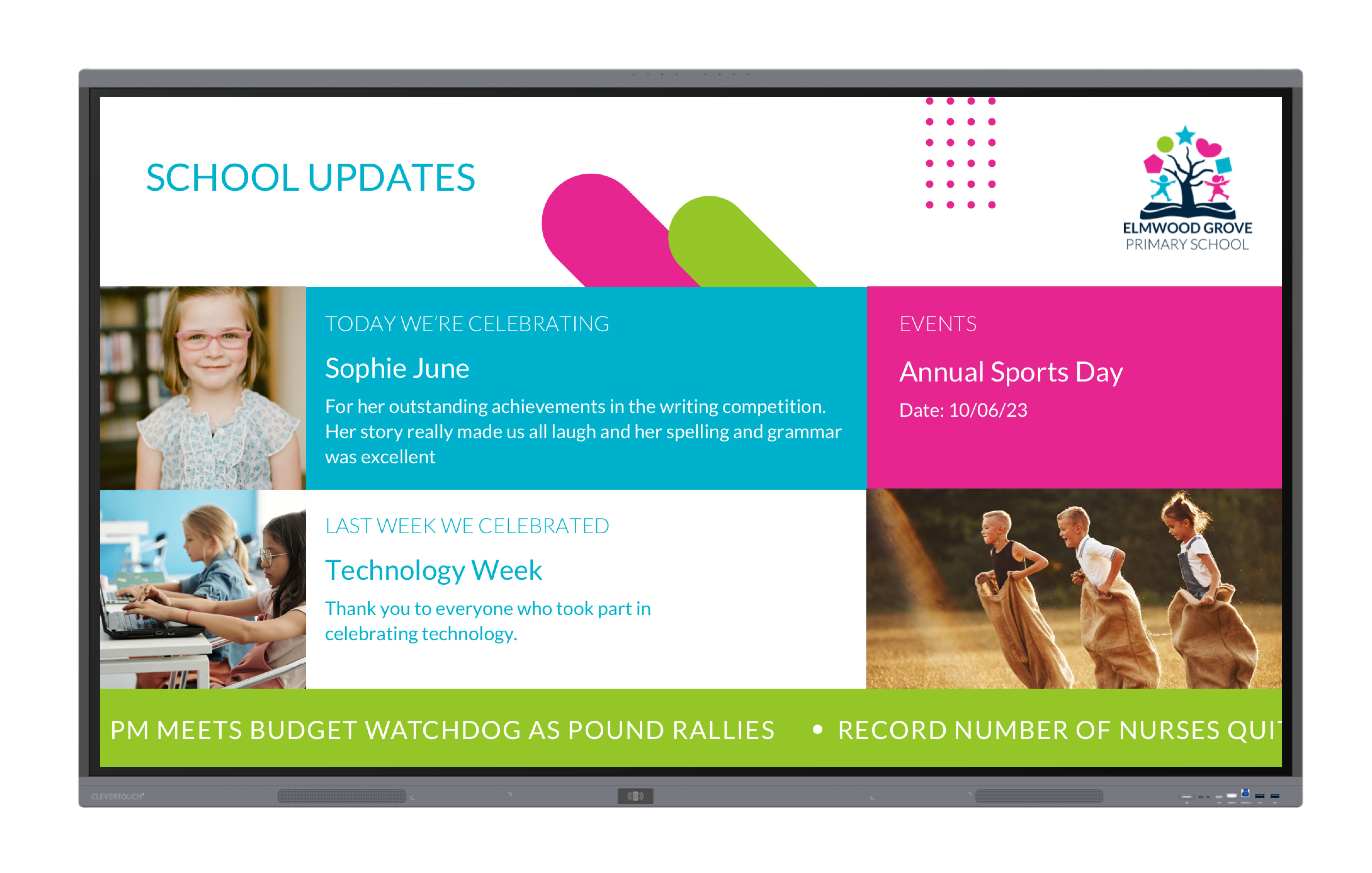 CleverLive to oparta na chmurze platforma do zarządzania treściami digital signage, która łączy wszystkie produkty Clevertouch, umożliwiając nadawanie komunikatów, ogłoszeń i alertów. Korzystaj z edytowalnych szablonów lub twórz własne prezentacje.
