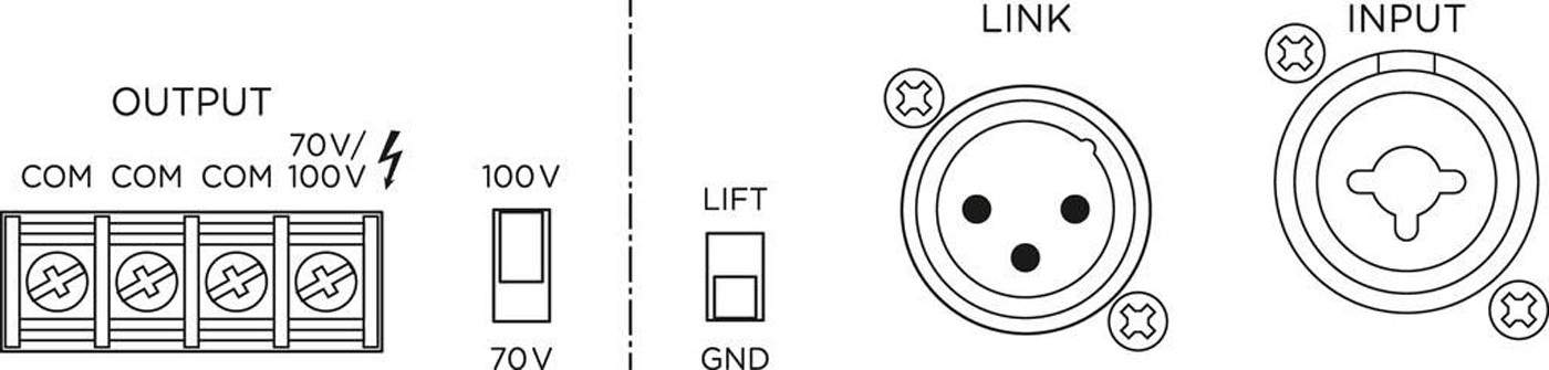 - Diodowe wskaźniki przesterowania, wł. zabezpieczenia, przegrzania oraz poziomu wyjściowego oraz trybu 100V/70V